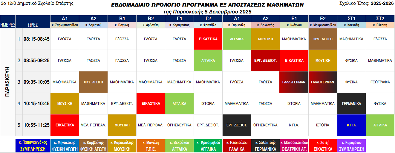 Το ωρολόγιο πρόγραμμα τηλεκπαίδευσης της Παρασκευής 5 Δεκεμβρίου 2025 βρίσκεται παρακάτω, ενώ τους συνδέσμους της ηλεκτρονικής τάξης κάθε εκπαιδευτικού έχουν λάβει στο e-mail τους όλοι οι γονείς/κηδεμόνες του σχολείου.