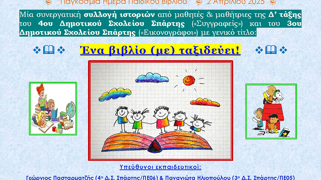✍️ Το ένα σχολείο (4ο Δ.Σ.) έγραψε τις ιστορίες με γενικό τίτλο «Ένα βιβλίο (με) ταξιδεύει!».
