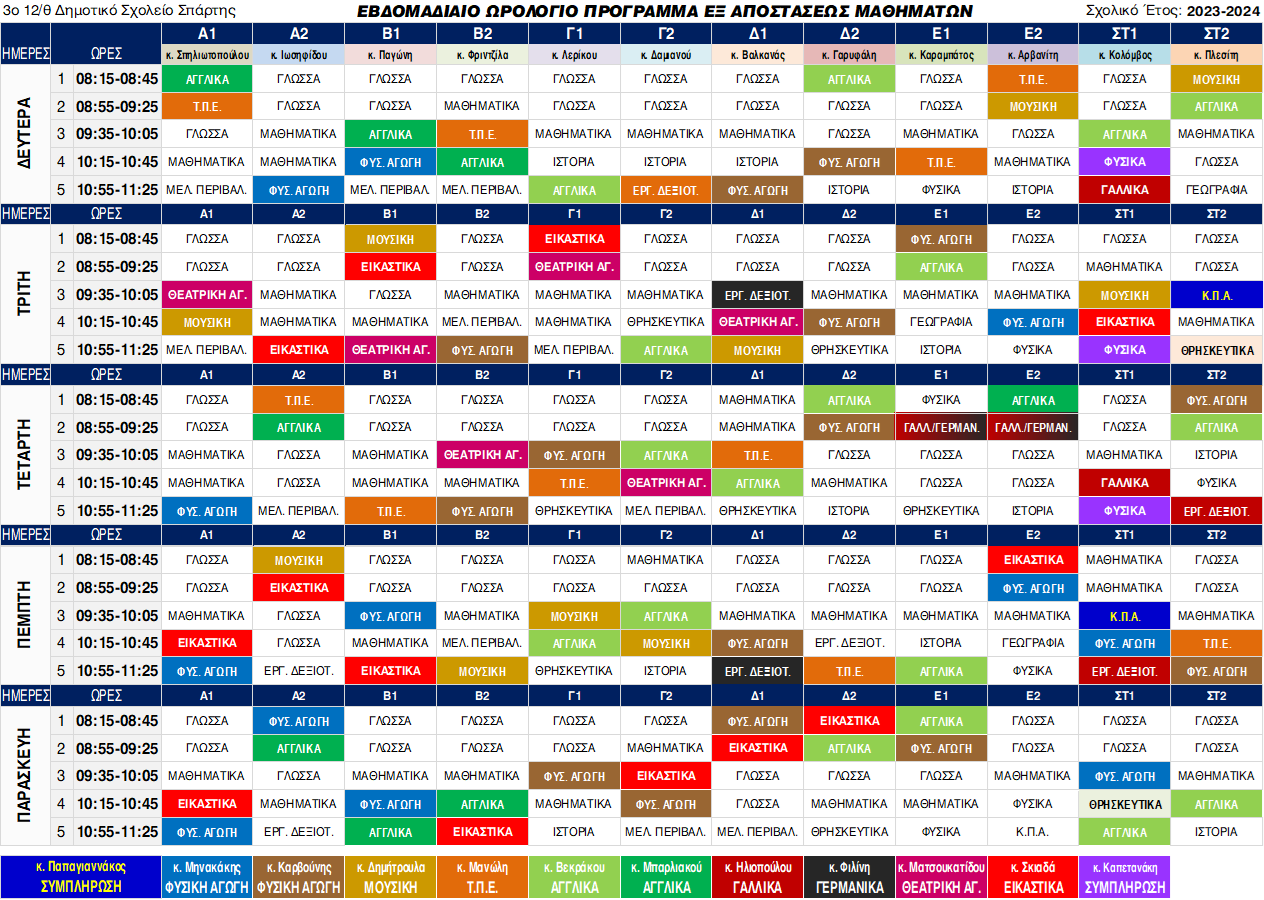 Σας γνωρίζουμε ότι αναστέλλεται η λειτουργία των σχολικών μονάδων Πρωτοβάθμιας Εκπαίδευσης του Δήμου Σπάρτης την Τετάρτη 12 και την Πέμπτη 13 Ιουνίου 2024, κατόπιν απόφασης του Δημάρχου Σπάρτης λόγω των έντονων καιρικών συνθηκών (καύσωνα). Το 3ο Δημοτικό Σχολείο Σπάρτης θα λειτουργήσει εξ αποστάσεως, με την παροχή τηλεκπαίδευσης μέσω της ηλεκτρονικής πλατφόρμας Webex, από τις 08:15 μέχρι τις 11:25 π.μ.. Το σχετικό πρόγραμμα, καθώς και τους συνδέσμους των ηλεκτρονικών τάξεων κάθε εκπαιδευτικού, έχουν λάβει στο e-mail τους όλοι οι γονείς/κηδεμόνες του σχολείου. Το πρόγραμμα μαθημάτων της τηλεκπαίδευσης είναι το ακόλουθο: