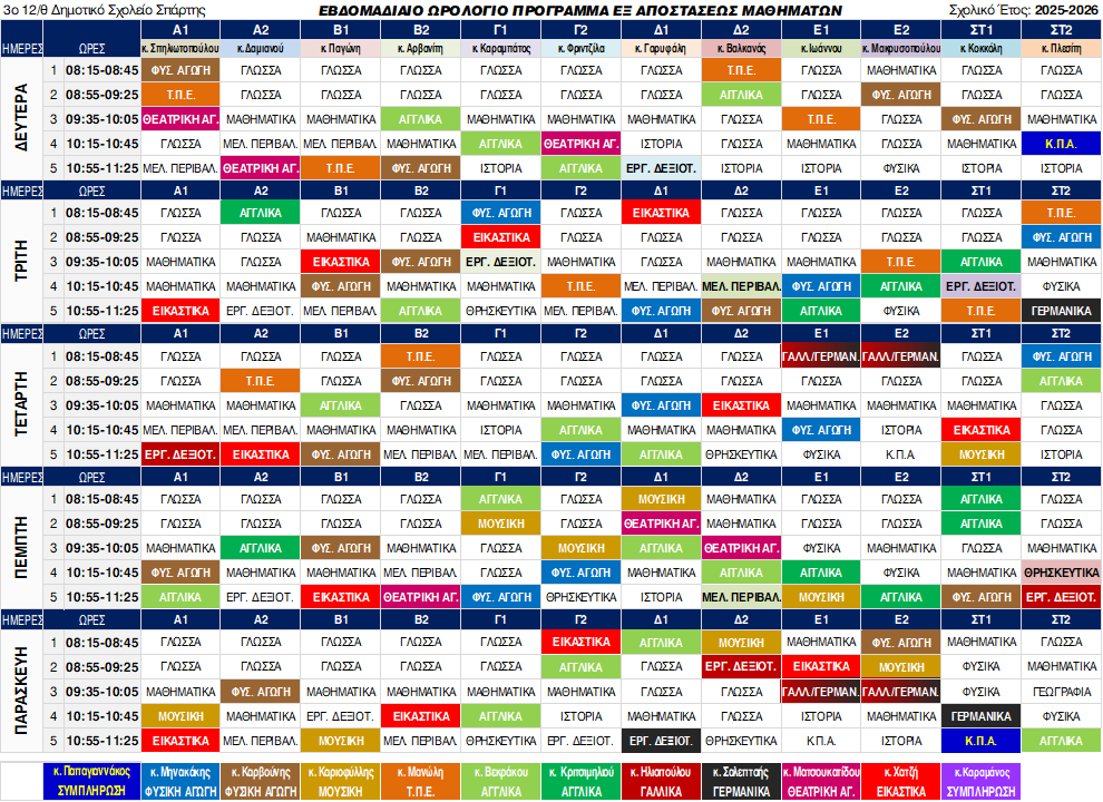 Το πρόγραμμα τηλεκπαίδευσης του 3ου Δημοτικού Σχολείου Σπάρτης για το σχολικό έτος 2025-2026 έχει διαμορφωθεί ως εξής: